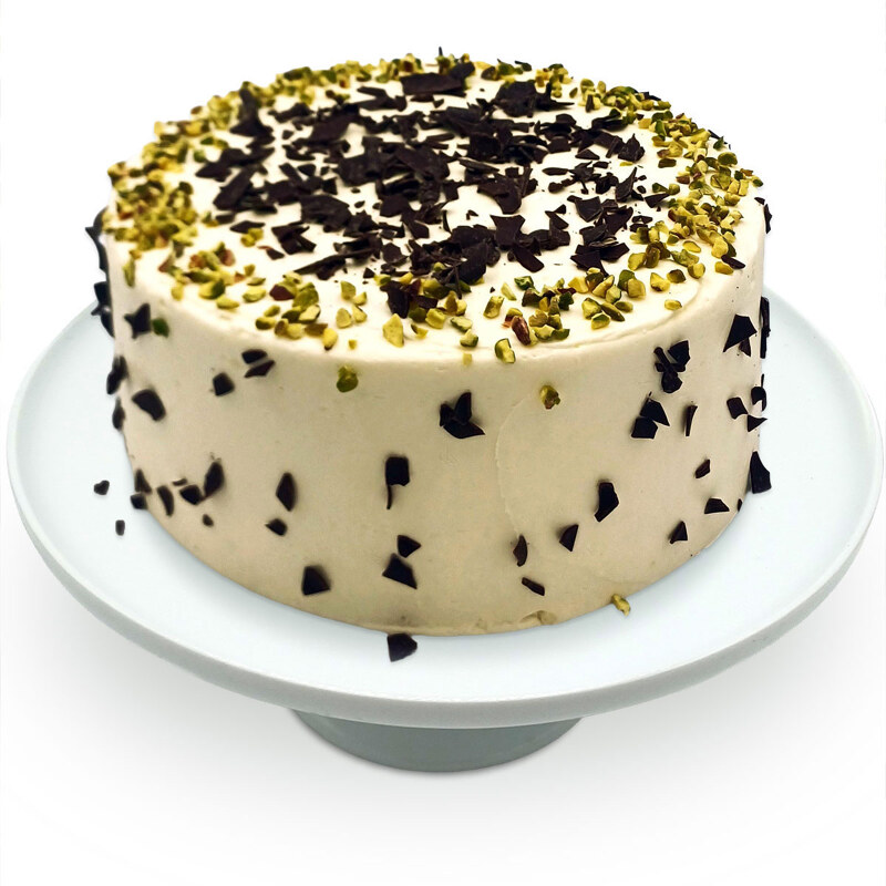 Our Chocolate & Pistachio Cake was created by popular demand! Soft chocolate sponge is layered with a pistachio cream filling mixed with crushed fresh pistachios, surrounded with our delicious cream cheese frosting, decorated with more crushed fresh pistachios and handmade dark chocolate flakes - a beautiful cake indeed!