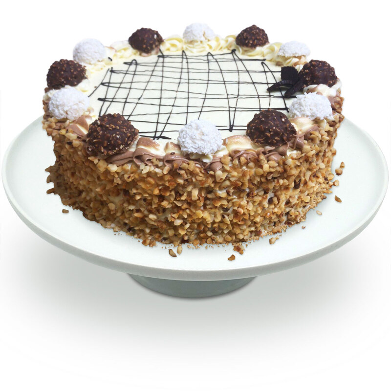 Fit for the Ambassador's reception, this exquisite cake is one of BHB's own creations. Tropical coconut infused sponge on a chocolate layered base, filled with a Ferrero Rocher/Nutella frosting with added delicate coconut flavour, is topped with an array of the infamous Ferrero Rocher and Raffaello chocolates, handmade chocolate leaves. chocolate sprinkles with a surround of crushed hazelnuts.