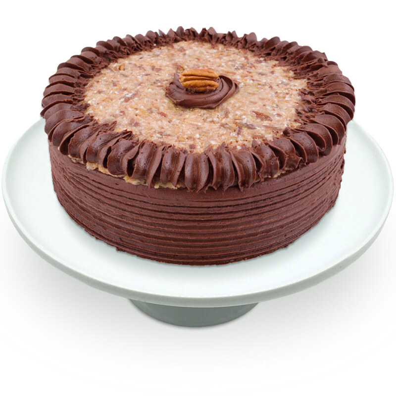 Our traditonal German Chocolate Cake is a gorgeously rich and moist layered chocolate sponge cake made with bittersweet chocolate filling with a Coconut and Californian Pecan frosting, topped with crushed pecans,tasty coconut shavings, and whole pecans. First created in 1957 in Texas, it became quite the sensation!