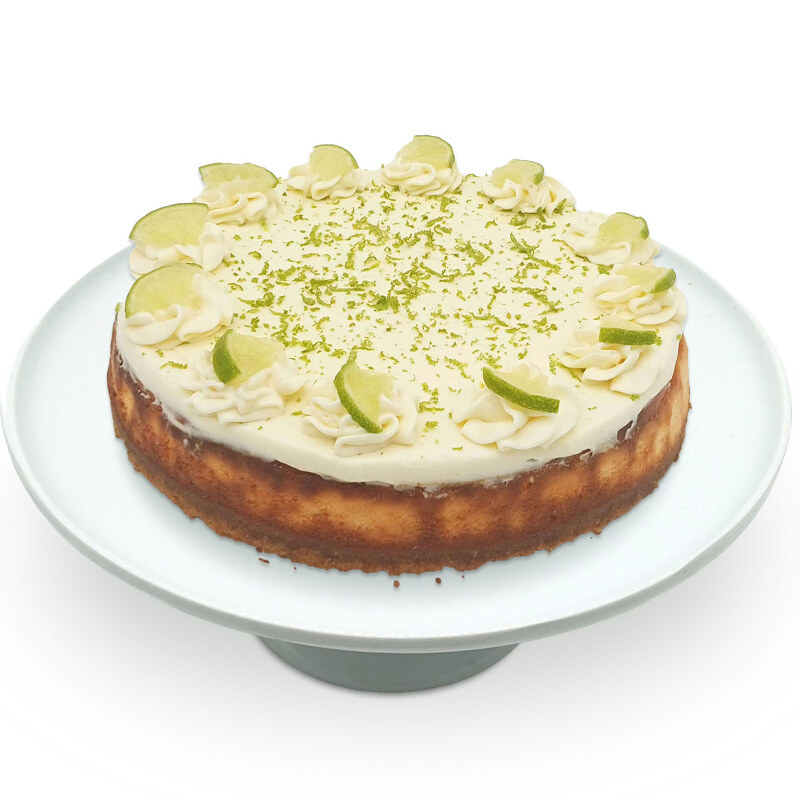 Our Key Lime Cheesecake is a refreshing and zesty cake! Soft cream cheese mixed with lime juice and lime zest on a crunchy biscuit base and topped with fresh lime slices and sprinkles of lime rind.