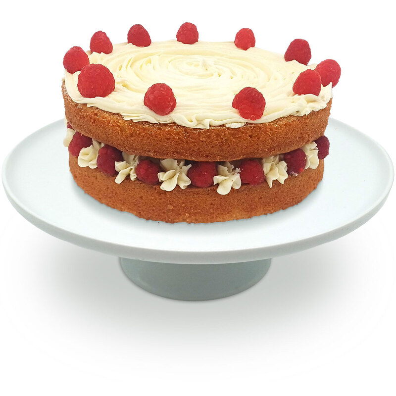 Fresh raspberries and soft cream cheese fill this light and fluffy vanilla sponge cake topped with more raspberries and sprinklings of sugar - a delightful tea cake!
