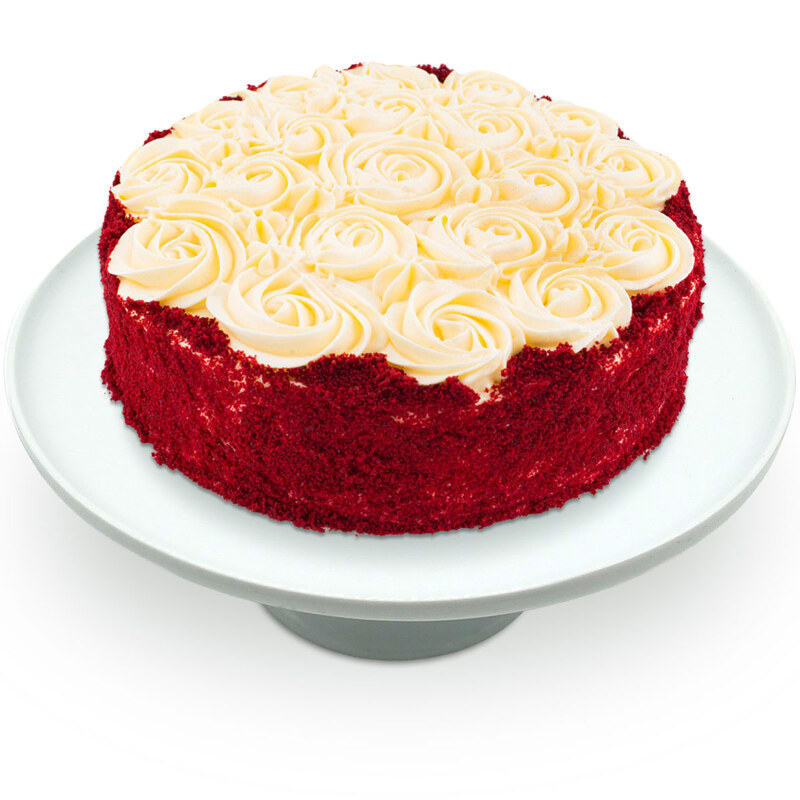 One of our most popular cakes, our delicious Red Velvet Cake is made with red chocolate sponge, layered with buttercream and topped with our famous cream cheese frosting, designed in an elegant rosette pattern, surrounded by red velvet crumbs.