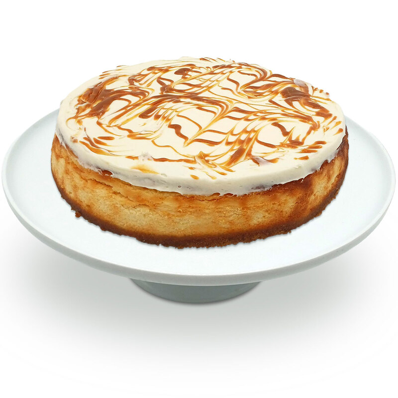 Our scrummy Salted Caramel Cheesecake is made with soft cream cheese mixed with salted caramel, on a buttery biscuit base and topped with a caramel swirl design. An eye catching cake!