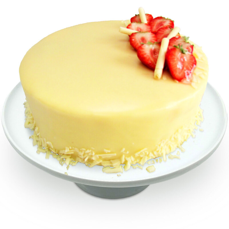 Our Strawberry & White Chocolate Cake is made of moist vanilla sponge with double layers of fresh strawberries and buttercream, decorated with a handmade white chocolate ganache, topped with glazed fresh strawberries and white chocolate cigarillos. A fresh summer delight.