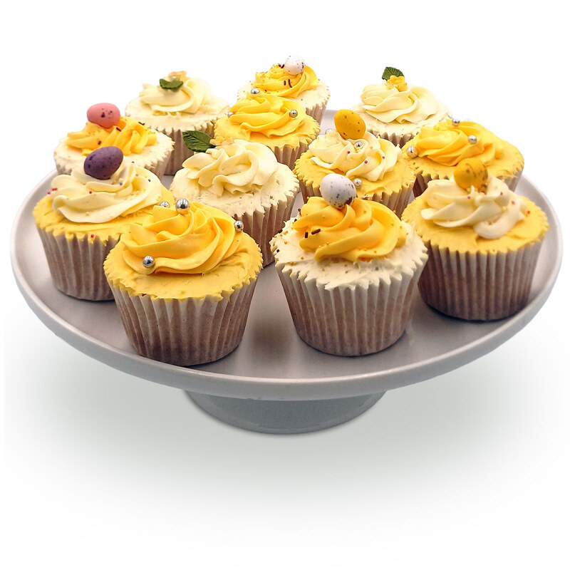 Our Easter Cupcakes are made of soft vanilla sponge, half decorated with a yellow cream cheese frosting and the other half with white cream cheese, decorated with handmade sugar white and yellow flowers, leaves, sprinkles and chocolate eggs!