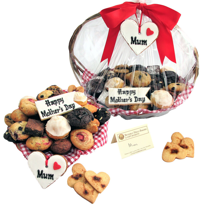 Spoil your precious mother with a red gingham cloth and ribbon gift basket filled with our delicious variety of mini muffins, cookies and brownies plus heart shaped chocolate & walnut brownies and heart shaped vanilla cookies. Decorated with a hanging handmade giant heart shaped vanilla cookie "Mum" and a handwritten cookie banner "Happy Mother's Day". You could also add a little bubbly to celebrate in style!