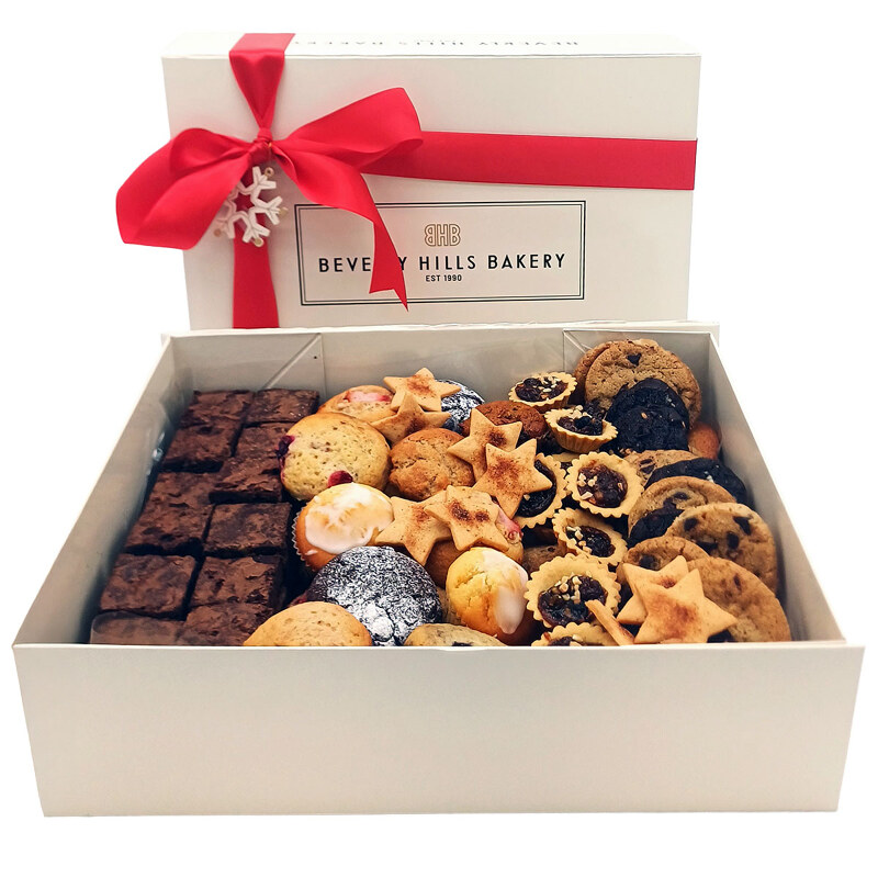Our NEW Christmas Gift Box is filled with delicious festive treats to enjoy with your celebrations! Handmade mini mince pies, cranberry & white chocolate brownies, vanilla star-shaped cookies and cranberry muffins join our Classic selection of freshly baked mini muffins, cookies and brownies, elegantly packaged in our BHB Gift Box with red gingham cloth and ribbon and a hanging Christmas decoration.
